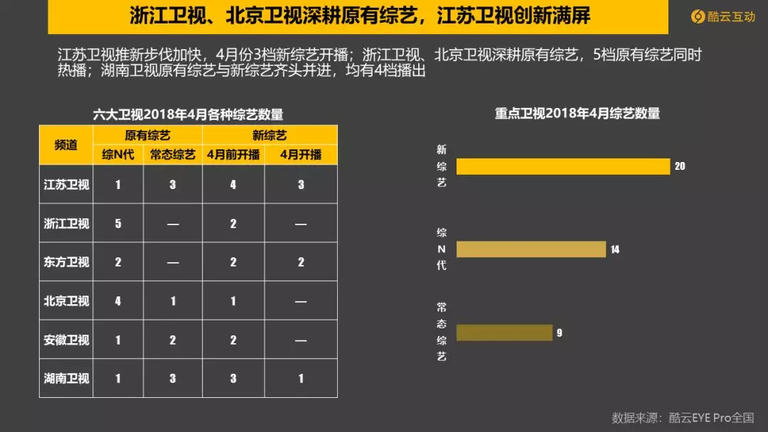 2. 4月,江苏卫视推新步伐加快,强势开播3当新综艺;浙江、北京卫视更看重原有综艺,5档原有综艺持续热播;湖南卫视原有综艺与新综艺齐头并进。