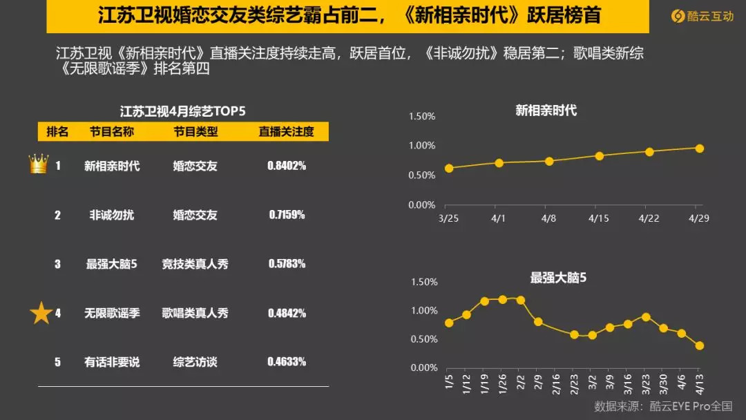 3. 江苏卫视全素人节目《新相亲时代》受到广泛关注,直播关注度持续走高。