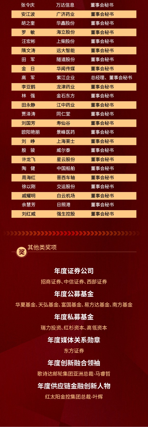 本次荣誉盛典现场共颁发了“年度价值勋章”、“年度投资者关系勋章”、“年度董事会勋章”、“年度资本创新勋章”、“年度品牌影响力勋章”、“年度领袖勋章”、“年度董事会秘书勋章”、“年度新锐董事会秘书勋章”、“年度新锐上市公司勋章”、“年度投资机构”等12项资本市场大奖。以下是完整榜单: