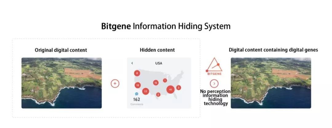 Bitgene的数字基因技术会在图片上加入像素级别的数字基因,虽然肉眼难以辨认,但实际上两幅图有细微的像素上的差别,每一张碎片都有全局完整的信息。该数字基因抗裁剪、抗缩放、抗旋转、抗压缩,跟二维码的容错功能类似。
