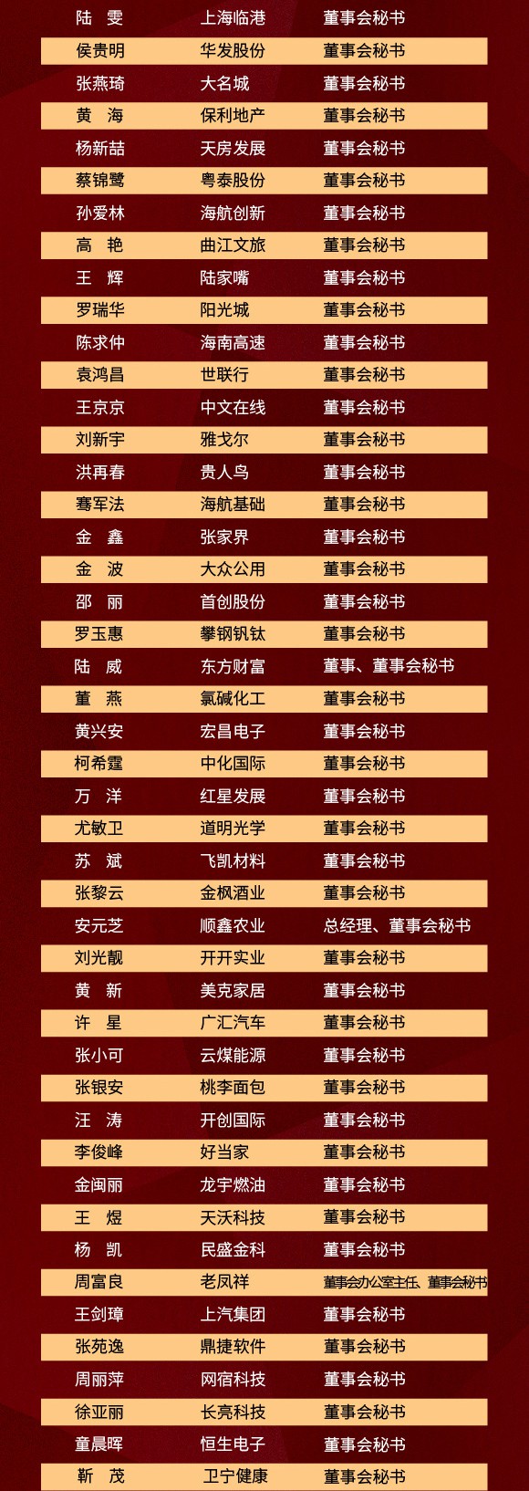 本次荣誉盛典现场共颁发了“年度价值勋章”、“年度投资者关系勋章”、“年度董事会勋章”、“年度资本创新勋章”、“年度品牌影响力勋章”、“年度领袖勋章”、“年度董事会秘书勋章”、“年度新锐董事会秘书勋章”、“年度新锐上市公司勋章”、“年度投资机构”等12项资本市场大奖。以下是完整榜单: