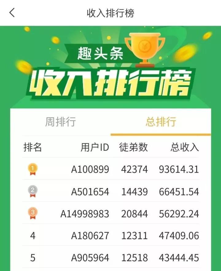 若徒弟有一段时间没有阅读,师傅还可以通过短信每天“唤醒”徒弟看新闻。在趣头条的排行榜上,总排名第一的用户收了42374位徒弟,拿到了9万多元的奖励。