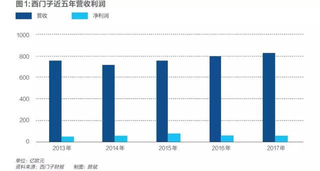 西门子的变化在资本市场获得了肯定,凯飒上任之初,西门子股价在76欧元,2017年间一度攀升至134欧元的顶峰,如今稳定在100欧元以上。而其营收和利润自2013财年至今均有小幅增长,2017财年,其营收和净利润分别为830亿欧元和62亿欧元。
