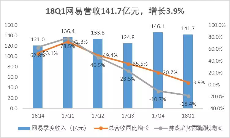 18Q1,网易线上游戏服务营收88亿元,去年同期为107.4亿元,下降18.4%。作为公司的核心,游戏业务的衰弱令整体业绩增长乏力,3.9%的营收增速创下近年新低。
