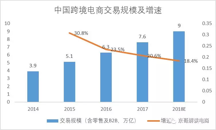 但目前跨境电商行业早已是一片红海,扩张对于每个玩家来说都非常困难。还是来自艾媒咨询的数据,2017年中国跨境电商交易规模(含零售及B2B)为7.6万亿,增长20.6%,低于2016年的23.5%,并且预计2018年的增速将进一步降低至18.4%。