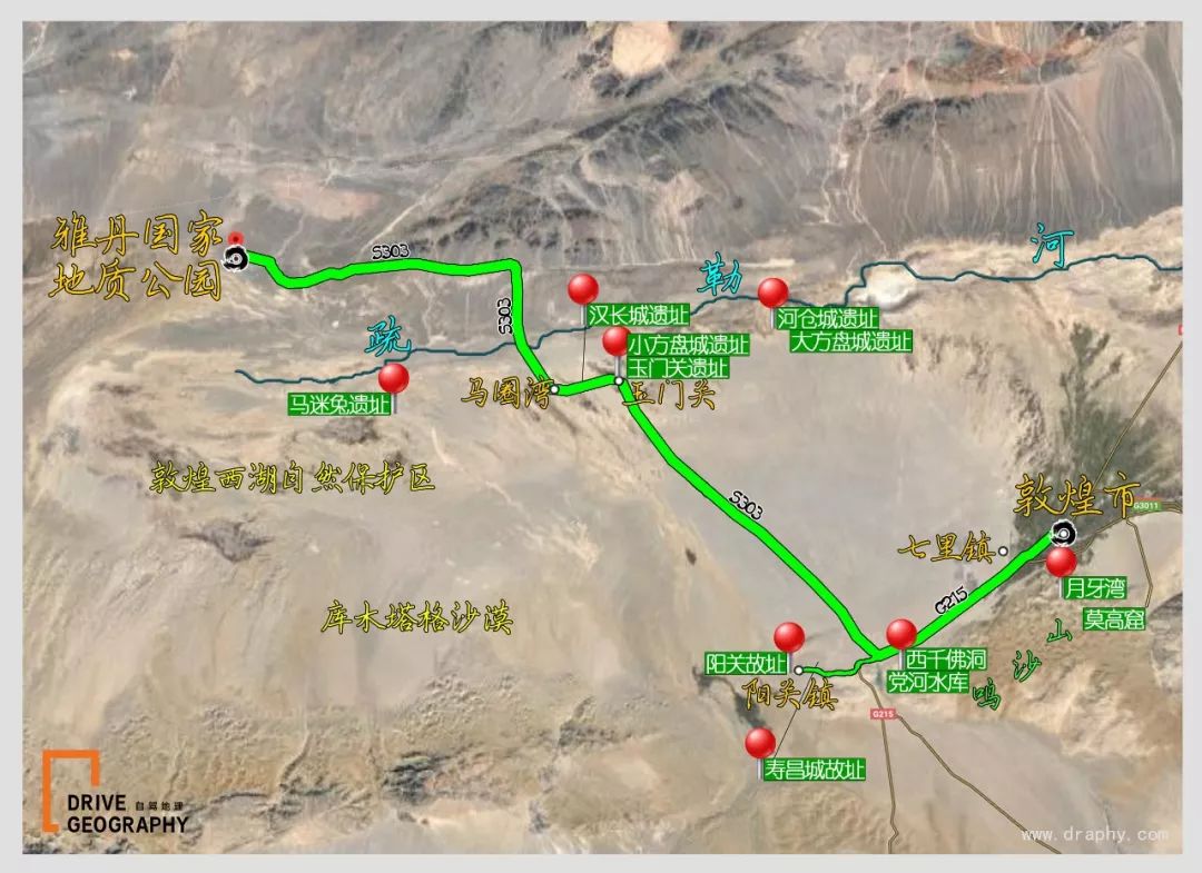 敦煌市 90km玉门关 10km马圈湾 60km雅丹国家地质公园 60km马圈湾 10km玉门关 90km敦煌市