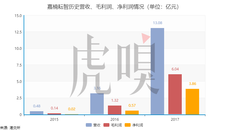 在过去的3年里,嘉楠的营收增长呈现出一种“爆炸”的状态,营收直接从2015年的0.48亿元飙升至2017年的13.08亿元,复合增长率高达2740%。但这还不是最夸张的,因为营收数字是三者中最小的,净利润方面2016年就较2015年增长了3091%。
