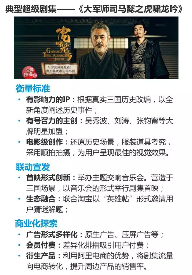 超级剧集充分调动产业链各环节的共振。能被称之为超级剧集的网络剧首先在于网络剧内容质量高,不仅是优质IP也有专业制作团队的加持;其次用户对于内容的认可度及接受度较高;再次,视频平台的力量也为超级剧集赋予更大能量;最后超级剧集为整个产业链甚至是泛娱乐布局都带来全面的升级,从剧集的制作、宣发到商业化探索相比以往都更具专业化和系统化,散发更大能量。