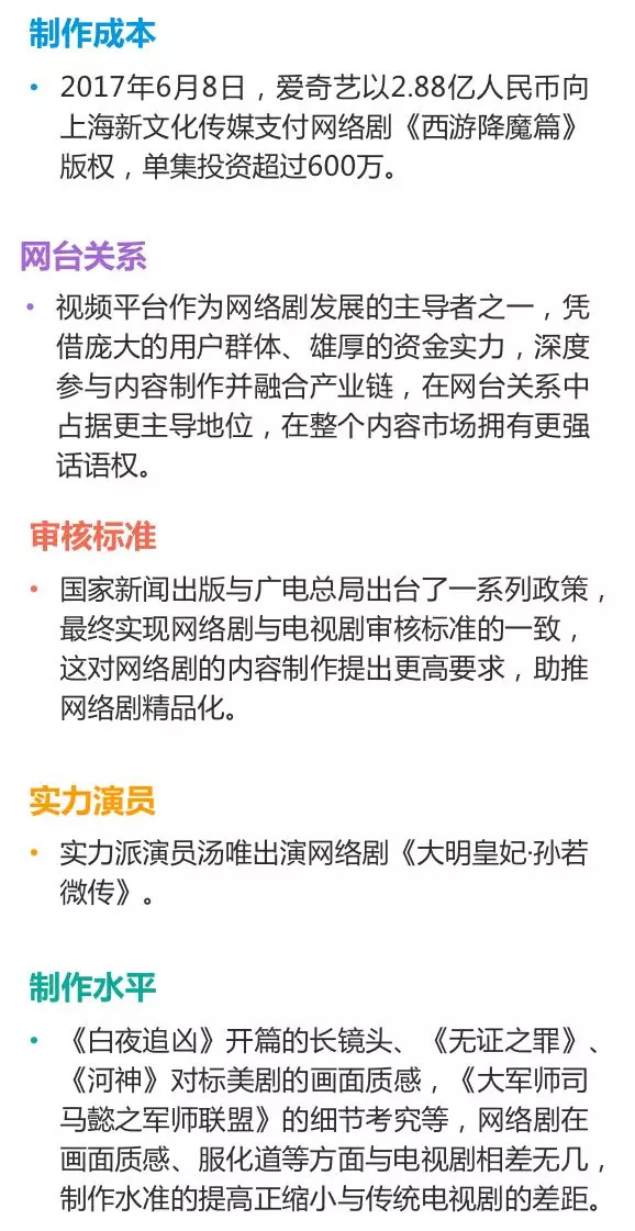 网络剧搭上精品化发展的快车,超级剧集所占比重不断提升,带动网络剧整体在制作成本、演员、制作水准、网台关系变化、审核标准五个方面缩小与传统电视剧的差距。网络剧受众规模不断扩大,而市场影响力也快速提升,对制作成本的持续高投入、对内容质量和影响力的始终追求使得网络剧在内容生产优质性上比肩传统电视剧。网络剧正在逐渐摆脱对电视剧的追随,与电视剧既有融合又有区分,拓展出一条独特的、有别于电视剧的创新发展道路。