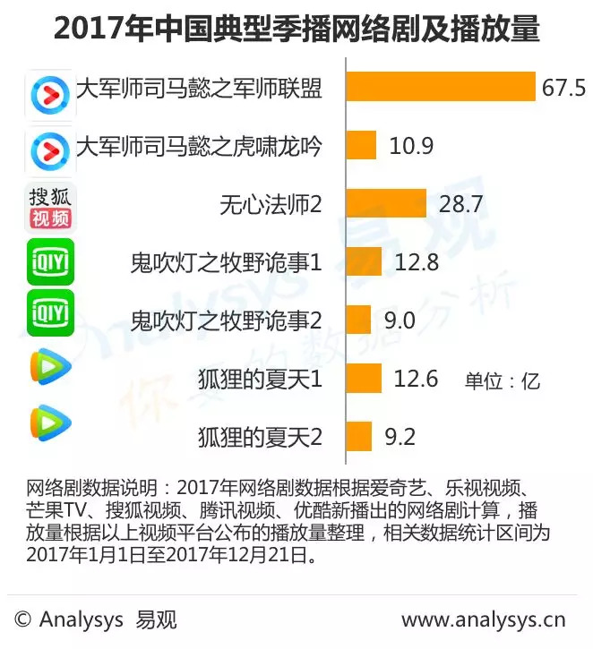 追了义和仲达兄弟搭,又追贺兰大人酷帅杀(分别指《三国机密之潜龙在渊》和《结爱·千岁大人的初恋》)。越来越习惯移动屏消费内容的年轻人娱乐需求,是催拥网络剧加速发展的主要动力,网剧火爆并强势反输电视台渠道播放。另一方面,网剧在内容上越来越以围绕大IP朝精品化发展,在制作水准和传播广度上,也大大超越了传统渠道。Analysys易观基于行业观察和大数据分析,洞察2018年及未来网络剧发展几大趋势。