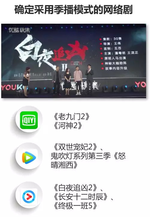 网络视频厂商本身的互联网企业基因,以用户为中心的产品思维与网络剧的结合使得中国网络剧季播模式已经基本成型,季播模式对网络剧的内容提出更高要求,预计季播剧的数量在明年还有更大增长。