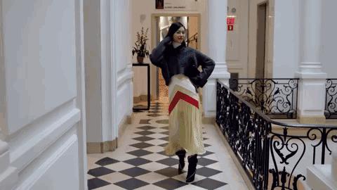搭配方面也是有很多小心机,一只裸色的 Malletage Pochette ,搭配同色系小裙子,造型整体感很足。
