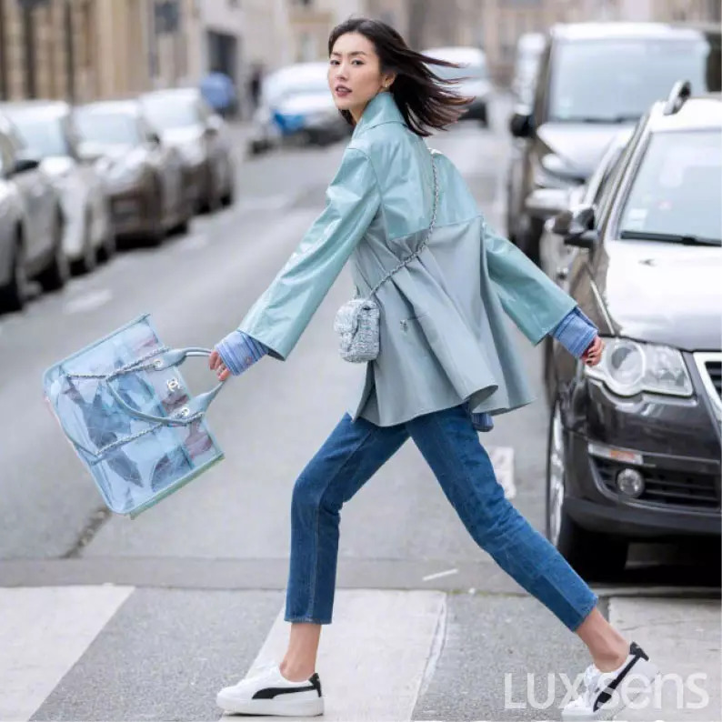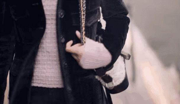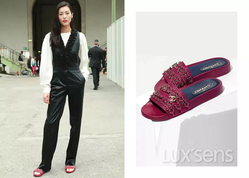 拖鞋也是她的最爱,去巴黎看秀也可以任性穿拖鞋,简约黑色丝质裤装搭配 Chanel 皮革链条款拖鞋,随意又不失大气。