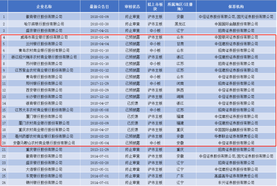 此外,值得关注的还有,徽商银行和哈尔滨银行于近期出现在终止审查名单中。此前徽商银行发布公告称,鉴于公司仍需就相关法律法规及证监会要求所涉及的部分事项与个别董事和股东进一步协商,并经董事会审议通过,决定撤回A股发行申请。哈尔滨银行在公告中则表示,鉴于哈尔滨银行内资股股权结构可能发生变动,经与保荐人审慎研究,并经该行董事会审议批准,决定撤回A股上市申请,待该行内资股股权结构变动完成后再重启A股上市申请。