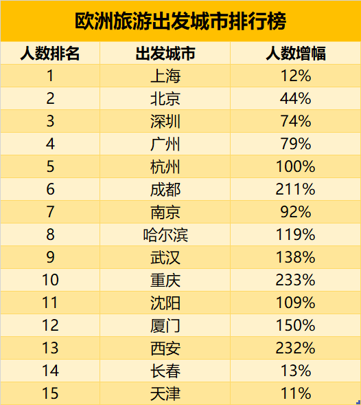 《报告》显示,中国一线城市依旧是欧洲旅游的主要客源地,但相比去年同期,深圳超过广州位居第三,前四名变成“上北深广”。增幅最快的则是成都、杭州、武汉、重庆、西安等新一线城市,一季度这些城市的欧洲游增幅达到100%到200%。