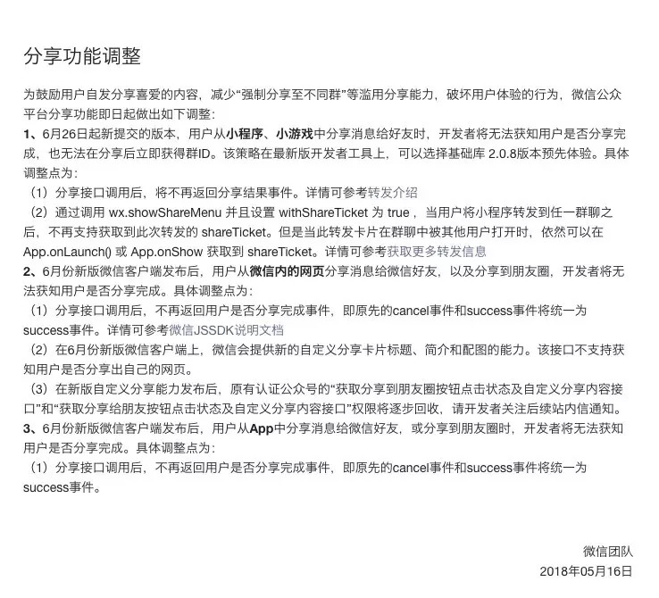 无独有偶,就在前几天,微信悄悄发布了一项涉及分享功能调整的公告,涉及小程序、小游戏、微信公众号、H5和app等。