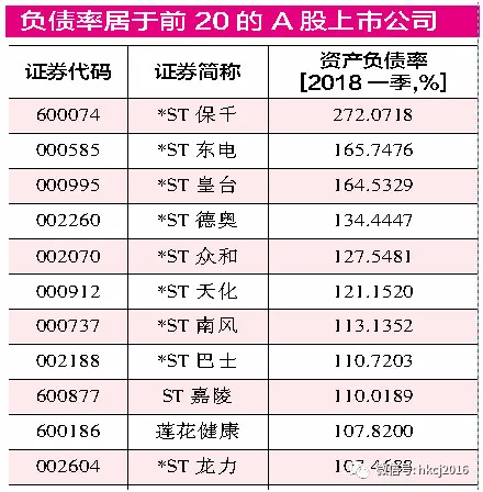 记者依据Wind统计,截至2018年一季度末,资产负债率高于100%的A股公司有18家,其中14家为ST公司。负债率超过70%的公司有374家,剔除银行保险外,上榜企业多为地产交建、煤铝钢铁、能源环保等产业。
