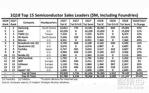 (2018年第一季度全球半导体厂商营收前十五名)