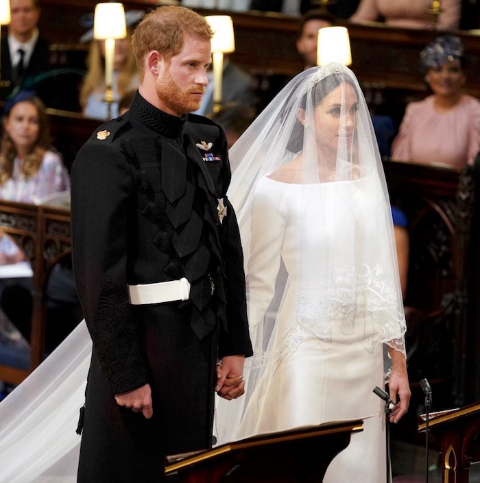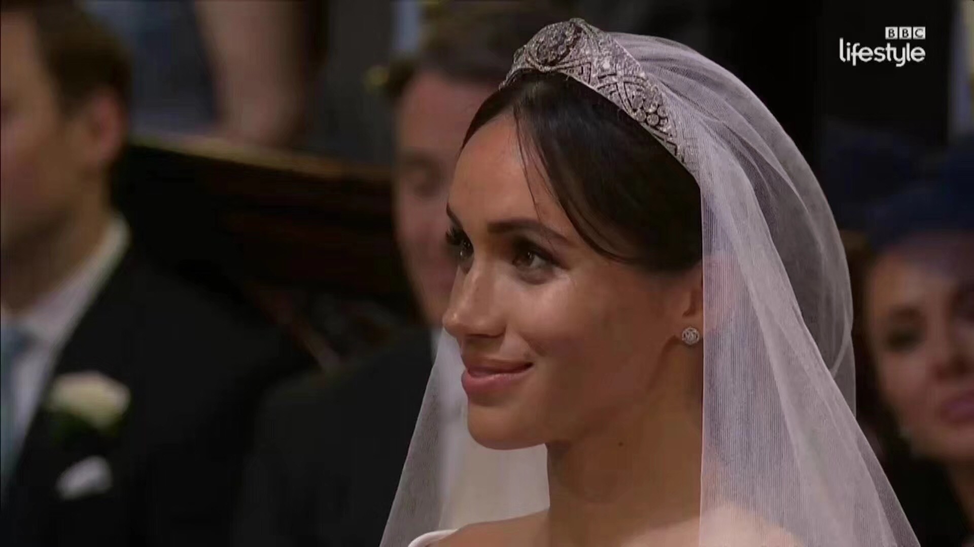 值得提到的,梅根今天与婚纱相配的珠宝都来自英国女王。其中,钻石头饰名为玛丽女王王冠,是件1932年制成的古董。