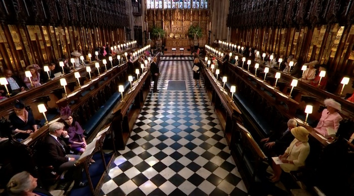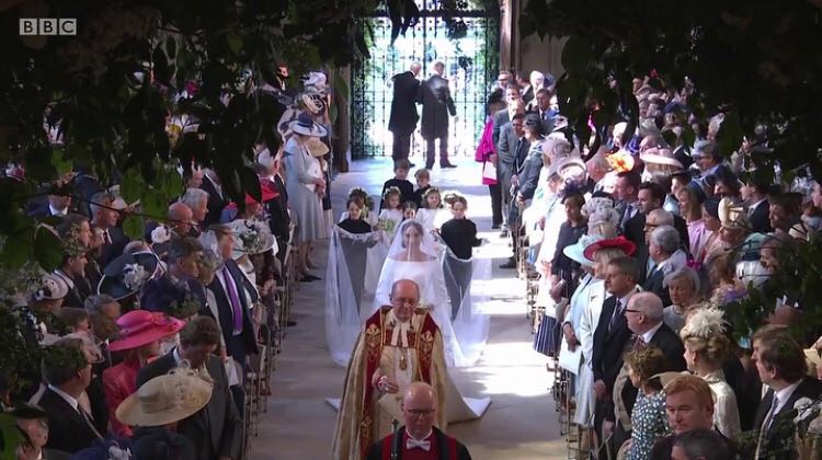 哈里王子和梅根王妃先在城堡内的圣乔治礼拜堂完成了结婚仪式,由坎特布里大主教Justin Welby和温莎教长David Conner分别主持婚礼和议程。接着二人乘坐南瓜马车沿着温莎城堡游行约半小时与民众见面,然后回到温莎城堡内举行了午宴。