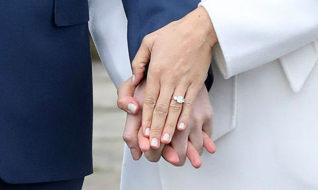 二人订婚时,哈里王子送梅根的戒指是英国王室品牌Cleave and Company的三钻黄金戒指。中心主钻是博茨瓦纳的祖母绿切割钻石,左右两侧的小钻石则取自王子母亲戴安娜王妃的胸针,这枚钻戒的造价约在人民币40万元左右。