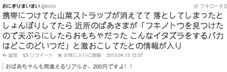“上次丢了个款冬花手机链,后来听说住在附近的阿姨说'捡了颗款冬花,回去做成天妇罗才发现竟然是个玩具,真不知道谁闹这样的恶作剧!'”