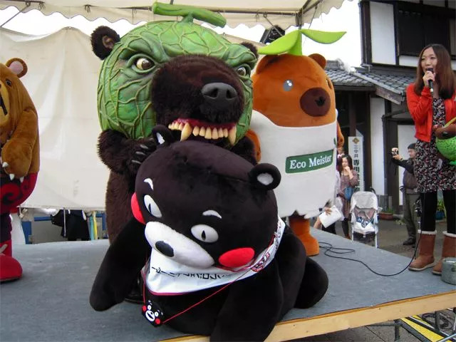 同样选择了男子气概风格的是来自北海道夕张市的蜜瓜熊。从这个名字可以看出,就是为宣传夕张市特产哈蜜瓜。它靠着吓哭孩子的外貌和逢吉祥物就咬的行为设定,树立了自己的地位,尤其爱咬比自己人气高的同行。