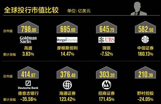 从2014年年初至12月17日收盘,中信证券(600030.SH)A股累计涨幅达160.13%,截至17日收盘,中信证券收报32.75元/股,市值共计582.50亿美元,已经超越418亿美元市值的德意志银行,仅次于高盛、摩根士丹利和UBS Gruop AG(瑞银)。