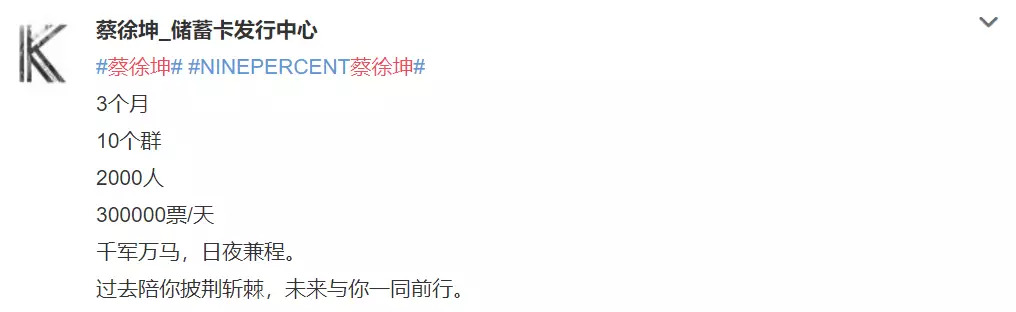 “小蔡是个人练习生,没有自己的经纪公司,所以舆论管控、个人营销这些都没有人帮他做,我们粉丝其实也是希望自己能够充当经纪公司的角色,毕竟我们是小蔡唯一的依靠了。”