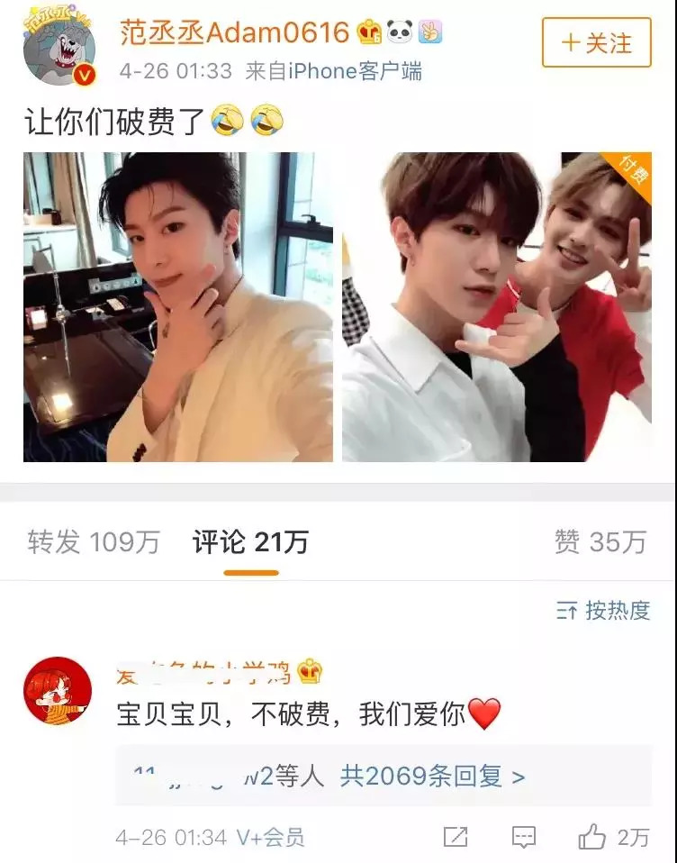 4月26日,范丞丞在微博上开通了明星V+会员服务,粉丝可以靠支付60元,在接下来的半年时间里看到明星发布的私照和享受其他福利。而就在范丞丞发布首张照片当晚,就有八万人为此买单,累计付费金额达到480万元……