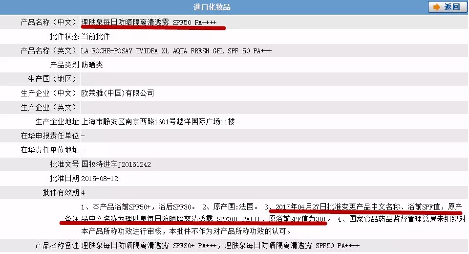 在防晒标识新规实施后,不少外资品牌如理肤泉、雅漾、雅诗兰黛等品牌的进口防晒产品对原批件进行了信息变更,将原有的标识调整为SPF50/PA++++。这也就意味着,此类防晒产品原本的防晒效果就已达到了变更后的指标。