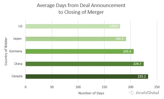 在上述42单交易中,涉及美资买方的交易完成交割的平均用时最短,为179.9天。涉及加拿大和中资买方的交易平均用时最长,分别为233.2天及224.7天。