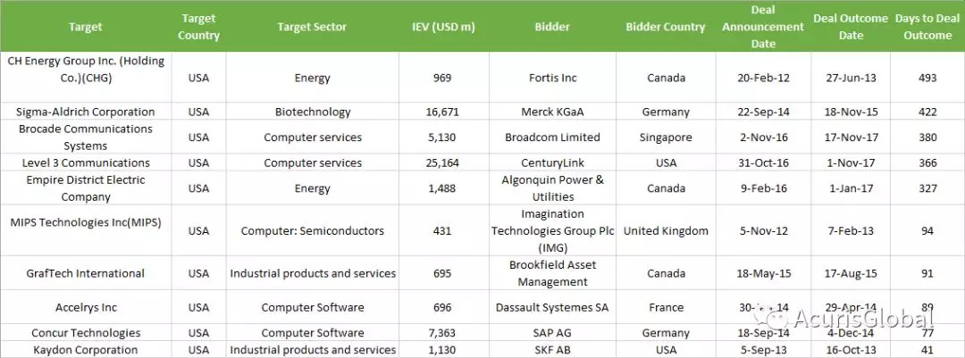 下表列出了从交易公布到完成交割用时最长的5单交易和用时最短的5单交易。