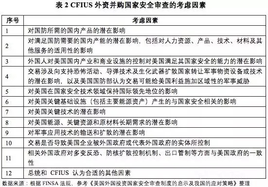 “国家安全”是美国外资并购国家安全审查制度中最为核心的内容。相关法律并未对国家安全及其审查标准做出确切的定义,而是通过列举审查时应该考虑的因素来进行侧面的注解,如表所示: