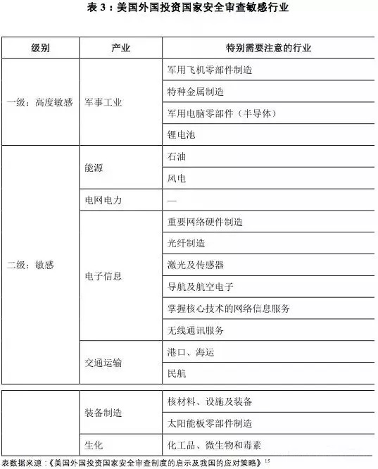 有学者将相关制度和CFIUS审查及否决的案例结合,并综合考虑FINSA的规定,模拟分析出美国外国投资国家安全审查敏感行业包括军事工业、能源、电力电网、电子信息、交通运输、装备制造、生化等。