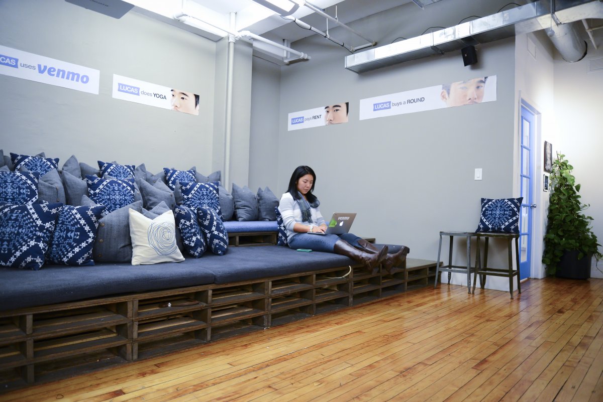 【14】Venmo(小额移动支付平台)曼哈顿办公室的墙上是用纸糊的时髦艺术品和古董唱片。公司拥有专门的乐队练习房,因为很多员工都是“音乐家”。员工都在沙发、长椅或者站立式桌子旁工作。公司里有剧场空间里的座位,可以让员工舒舒服服地放松,许多员工都在周末或者凌晨才外出。