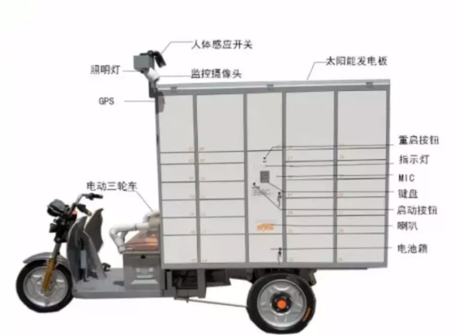 与普通固定式快件箱相比,移动快件箱少了屏幕、并用太阳能发电板代替了外接电源,三轮车底盘也可以根据情况更换为四轮底盘或活动轮。