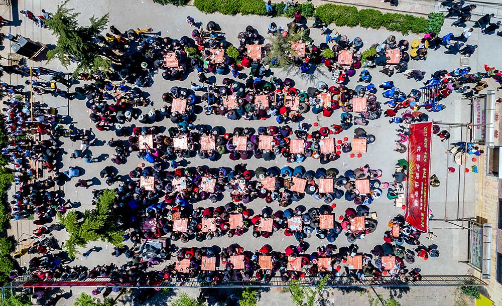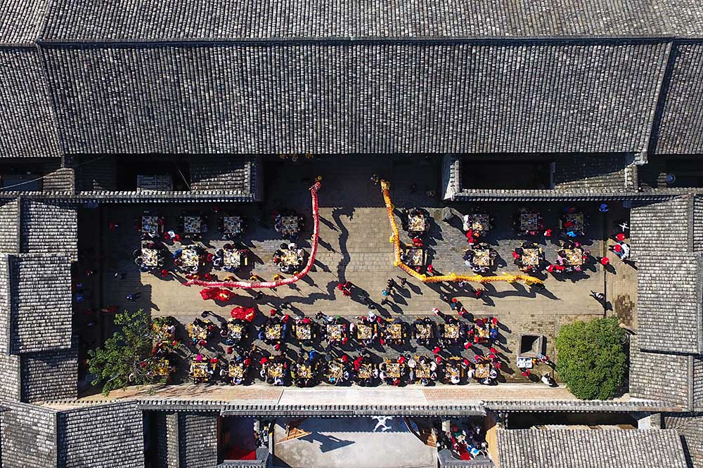 江西赣州,航拍龙南县境内的关西新围,游客和嘉宾正在这里品尝客家千人宴。当天,“中国围屋之乡”江西龙南县关西围景区人头攒动,热情的客家龙南人舞龙、舞狮,摆千人宴,以客家礼仪热烈欢迎游客的到来。