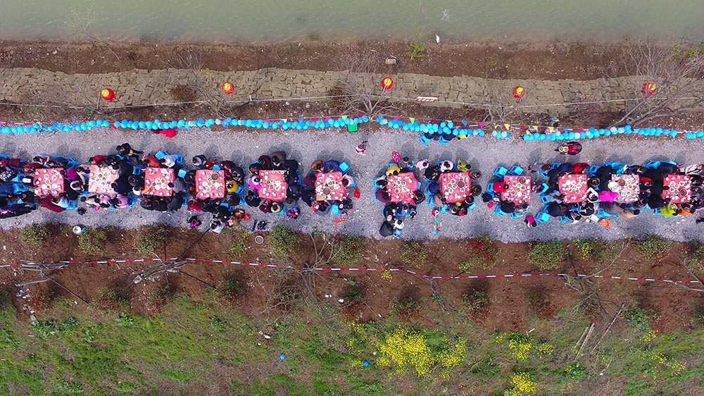 航拍1300余名游客在安徽省滁州市全椒县大墅镇万亩桃花林里参加“千人宴”活动。