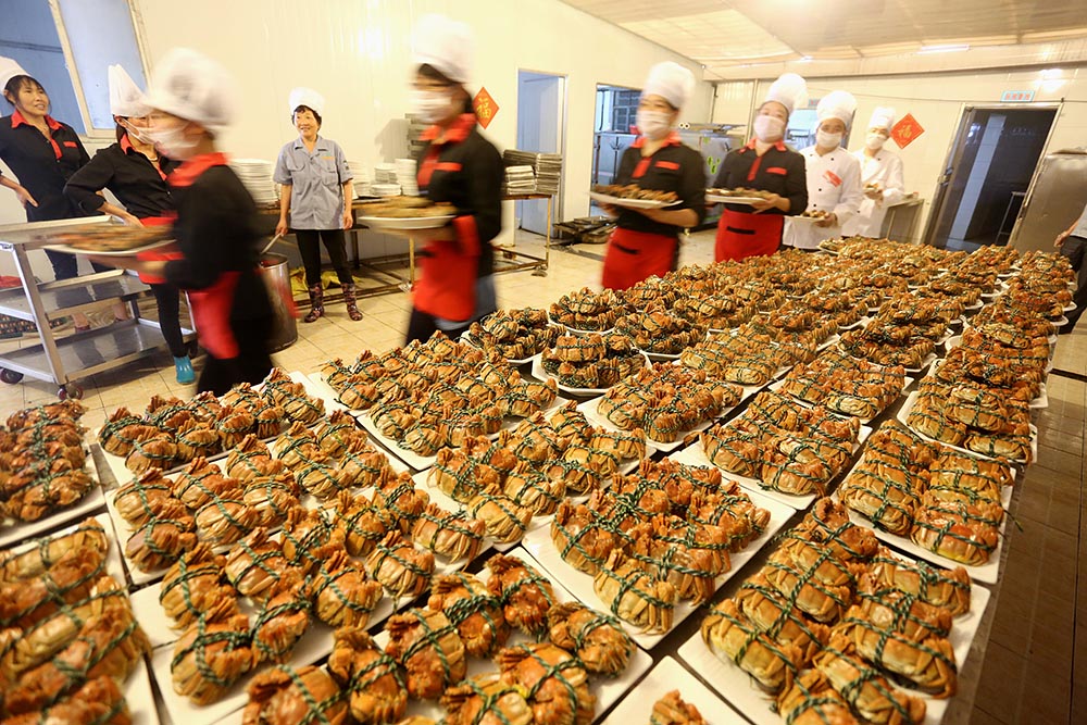 江苏泰州,姜堰区一假日酒店,服务员为“八鲜宴”准备簖蟹。
