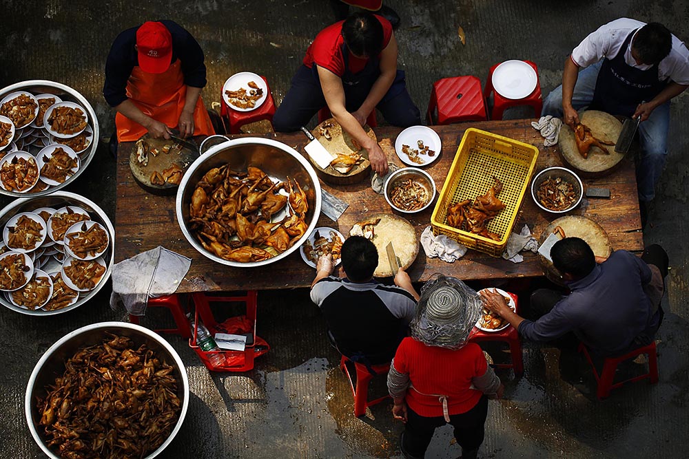 广东顺德,连杜水月宫生财盛会,晚宴席开2000围,厨房紧锣密鼓地准备食材。