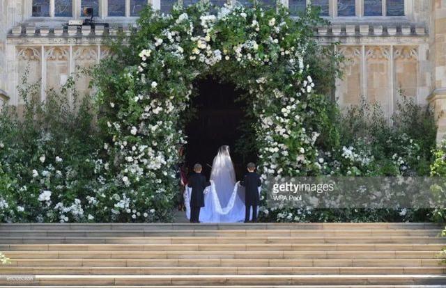 教堂入口摆起了一道花墙,主要用了白玫瑰、毛地黄和梅根最爱的牡丹,非常梦幻。