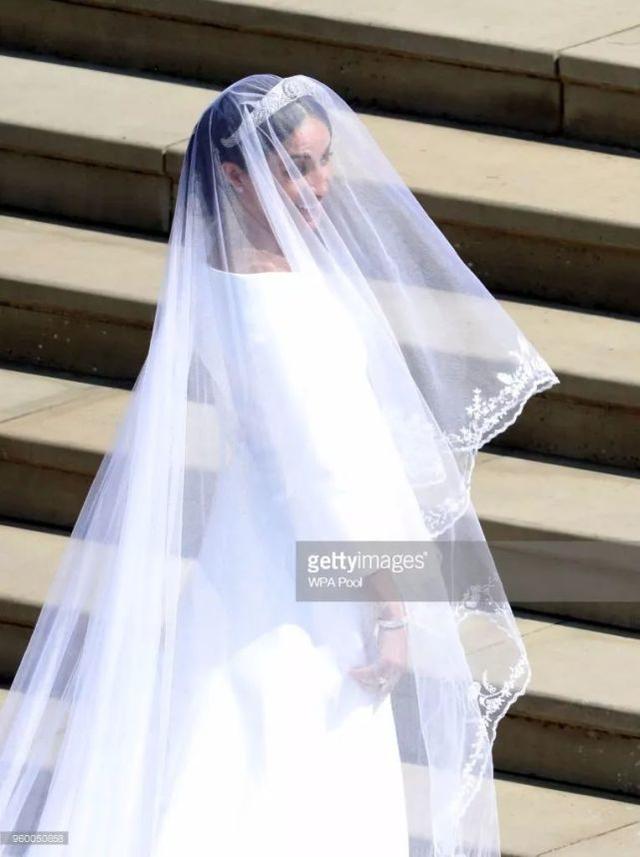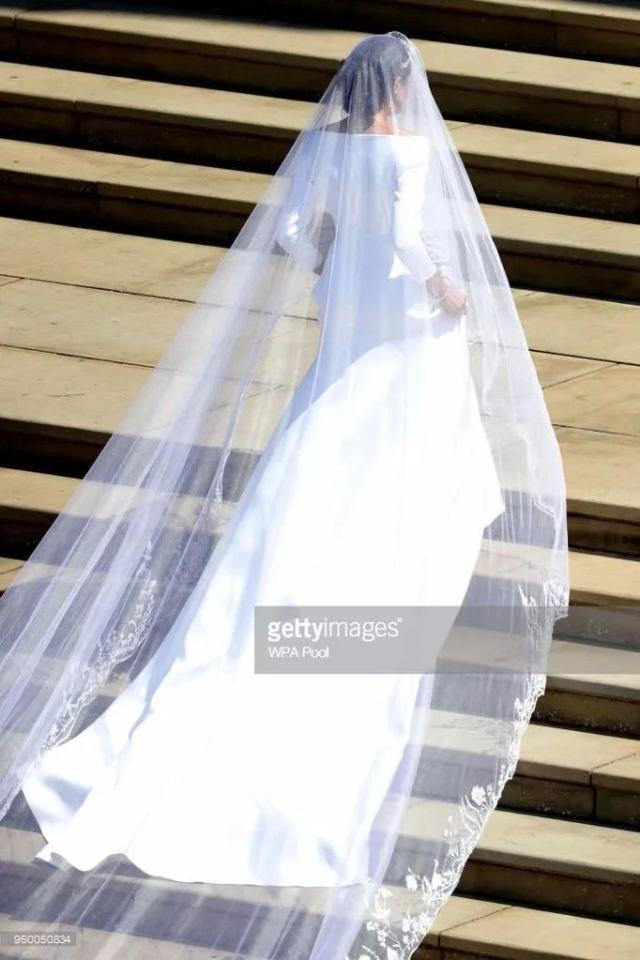 头纱上绣有代表英联邦53个成员国的53朵花,还有她和哈里王子的最爱的蜡梅和加利福尼亚罂粟花。为了缝制这个头纱,工人们花了数百小时,每三十分钟就要洗一次手,才能保持绢网和线的质感。婚纱价值10万英镑,由梅根买单~
