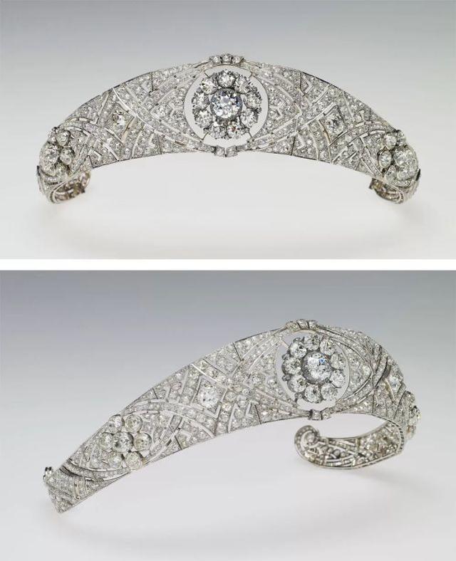 梅根戴的是Diamond Bandeau王冠,长得像一条钻石发带。它来自玛丽皇后,由女王借给梅根,也是英国祖传王冠之一。耳环则来自卡地亚。