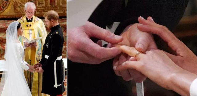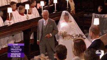 婚礼正式开始后,由哈里王子的父亲查尔斯王子在途中挽着梅根走过教堂,但因为他毕竟不是梅根的亲生父亲,所以没有把她交到哈里王子手里这一步。