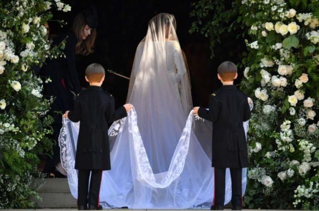 花童有乔治小王子,哈里王子的教子和梅根好友的两个儿子,几个萌娃帮忙一起提梅根的大裙摆。