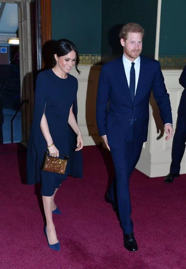 梅根和她的母亲提前一天就到达酒店,她穿着一条深蓝色连衣裙配灰色高跟鞋,整个人看起来容光焕发。