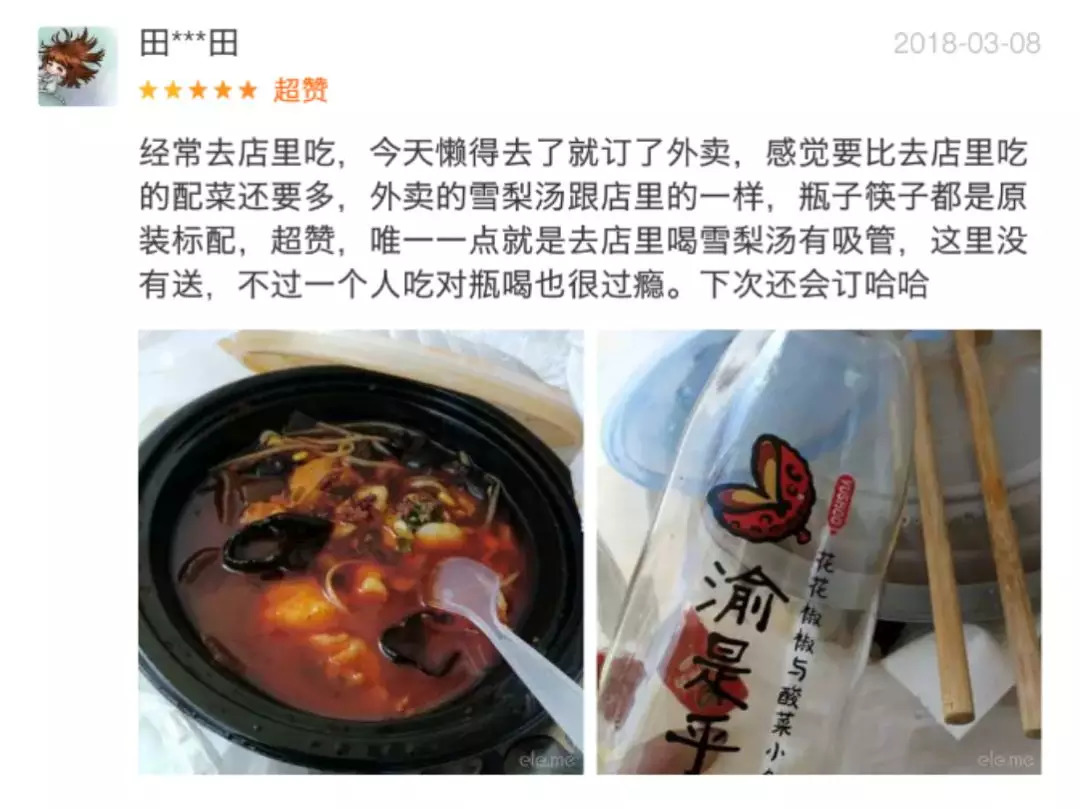 外卖的用户注重效率和体验,而这些往往都体现在细节中。渝是乎外卖包装是专利设计的,样式简约、不撒漏,并且还有个让用户惊喜的小细节:饮品用的是堂食的玻璃瓶。很多用户在收到后会感觉到超值,并会考虑复购。