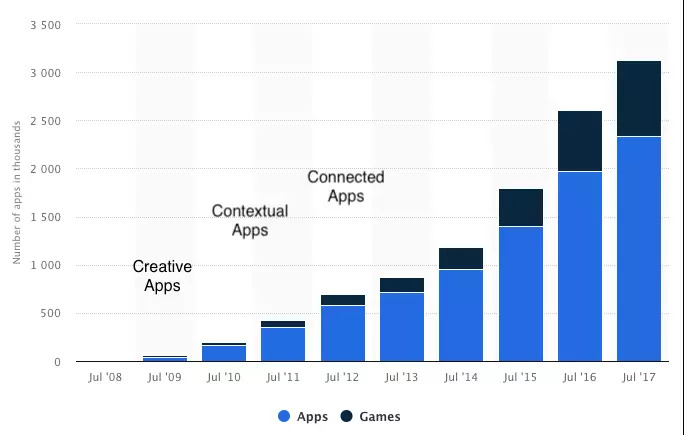 2008到2017年,iTunes App Store中的APP数量