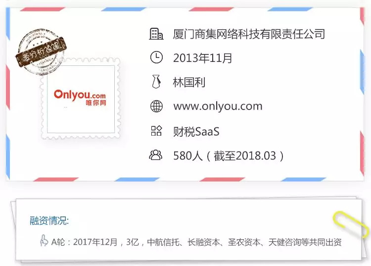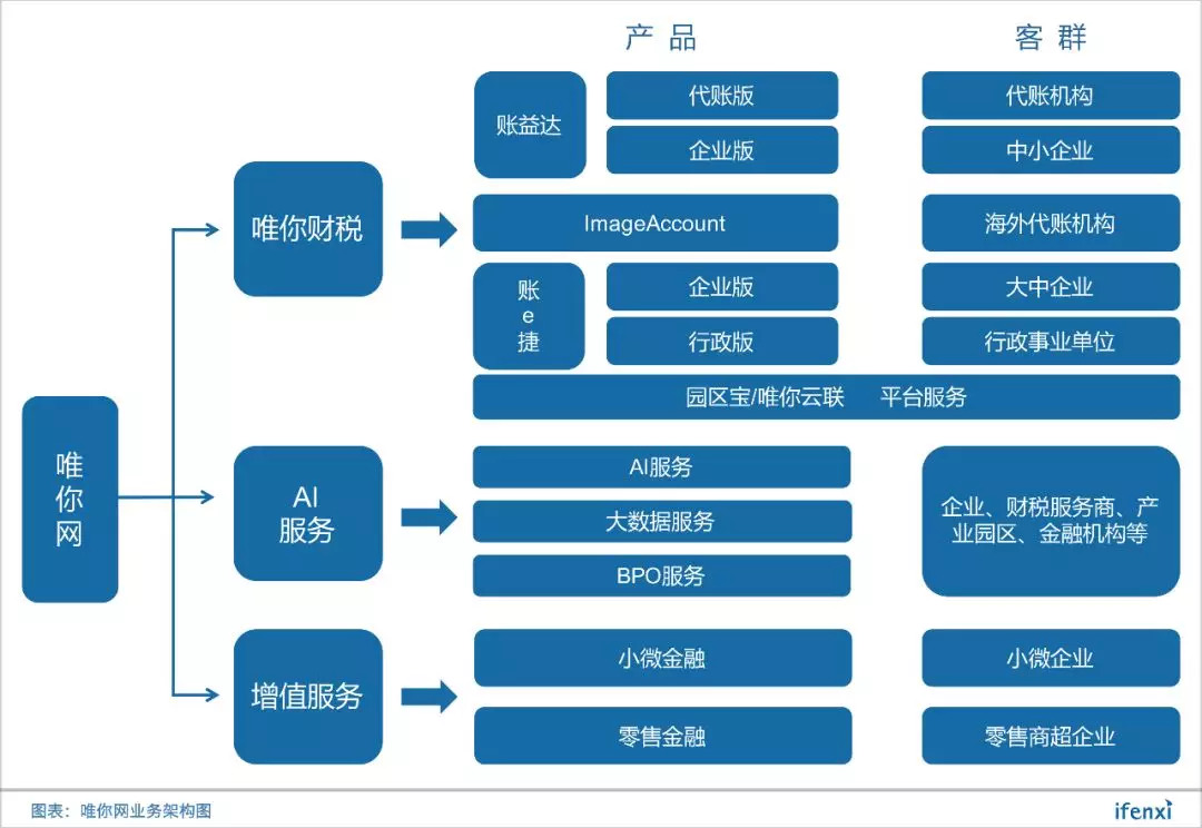 唯你网成立于2013年,总部位于厦门,核心业务为智能财税服务“唯你财税”,主要产品为服务小微企业的账益达和服务大中型企业的账e捷等一系列智能财税应用。除此之外,在财税服务的基础上,唯你网延伸出小微金融等增值服务。